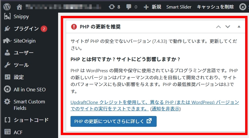 - 管理画面に「PHPの更新を推奨」というアラートが出ている